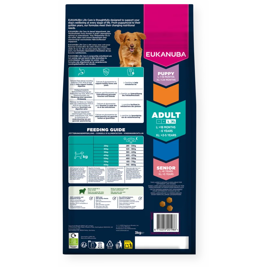 Η EUKANUBA Life Care προσφέρει υψηλής ποιότητας διατροφή βασισμένη σε επιστημονικά στοιχεία, ειδικά σχεδιασμένη για να καλύπτει τις μεταβαλλόμενες ανάγκες των σκύλων σε κάθε στάδιο της ζωής τους. Αυτή η ξηρά τροφή, πλούσια σε αρνί και ρύζι, έχει σχεδιαστεί ειδικά για ενήλικους σκύλους μεγάλων φυλών ηλικίας 18 μηνών έως 6 ετών (ή 2 έως 5 ετών για τις γιγαντιαίες φυλές). Η ήπια σύνθεσή της την καθιστά ιδιαίτερα κατάλληλη για σκύλους με ευαίσθητο στομάχι, καθώς το ρύζι είναι εξαιρετικά εύπεπτο. Ένα ειδικά σχεδιασμένο μείγμα ινών, που περιέχει πρoβιοτικά και πολτό τεύτλων, υποστηρίζει περαιτέρω την υγιή πέψη και τη βέλτιστη απορρόφηση θρεπτικών συστατικών. Εμπλουτισμένη με φυσικές πηγές γλυκοζαμίνης και ασβεστίου, αυτή η συνταγή βοηθά στη διατήρηση υγιών αρθρώσεων και ισχυρών οστών, επιτρέποντας στους σκύλους να απολαμβάνουν μια ενεργή και ευτυχισμένη ζωή. Εκτός από το αρνί, το κοτόπουλο αποτελεί μια άλλη πηγή πρωτεΐνης υψηλής ποιότητας, που υποστηρίζει την ανάπτυξη ισχυρών, άπαχων μυών. Περιλαμβάνεται L-καρνιτίνη για να βοηθήσει στον μεταβολισμό του λίπους, βοηθώντας τα σκυλιά να διατηρήσουν το βέλτιστο βάρος και μειώνοντας την πίεση στις αρθρώσεις τους για βελτιωμένη κινητικότητα.